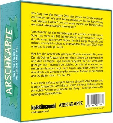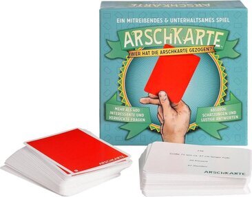 Arschkarte ist ein mitreißendes und extrem unterhaltsames Spiel. Mit mehr als 400 interessanten und verrückten Fragen, die alle eines gemeinsam haben: Sie sind lustig, abgedreht und nahezu unmöglich richtig zu beantworten. Aber zum Glück muss man das ja auch gar nicht... Wer hat die Arschkarte gezogen? Punkte sammelst Du, wenn Du mit Deiner Antwort der korrekten Lösung am nächsten bist und den richtigen Tipp darüber abgibst, wer die Arschkarte gezogen hat - nämlich der Spieler, der mit seiner Antwort am weitesten daneben liegt. Zum Tippen übergibst Du Deine rote Arschkarte vor Verkündung der korrekten Antwort an den Spieler,