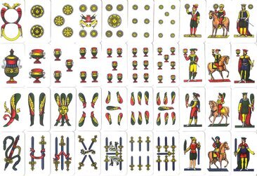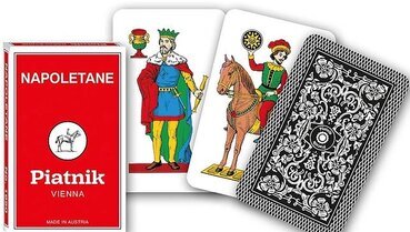 Scopa Karten, für das beliebte italienische Spiel. Gespielt wird üblicherweise mit diesen sogenannten napoletanischen Spielkarten. Meistens wird zu zweit gespielt, jedoch existiert eine Menge Spielvarianten. Gespielt wird mit 40 Karten in vier Farben.