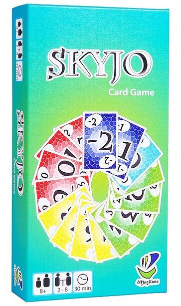 Skyjo ist ein spannendes Kartenspiel, das leicht zu lernen ist und  tolle Unterhaltung für die ganze Familie oder an einer Party bietet.  Dabei geht es darum, über mehrere Spielrunden möglichst wenige Punkte zu  sammeln. Denn am Ende jeder Spielrunde werden bei jedem Spieler die  Punkte gezählt und zu seinem bisherigen Punktestand addiert. Sobald ein Spieler 100 oder mehr Punkte erreicht hat, endet das Spiel